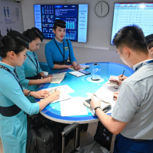 7月18日,陈于萱(右一)和同事在厦门航空乘务运行中心做航前准备工作。