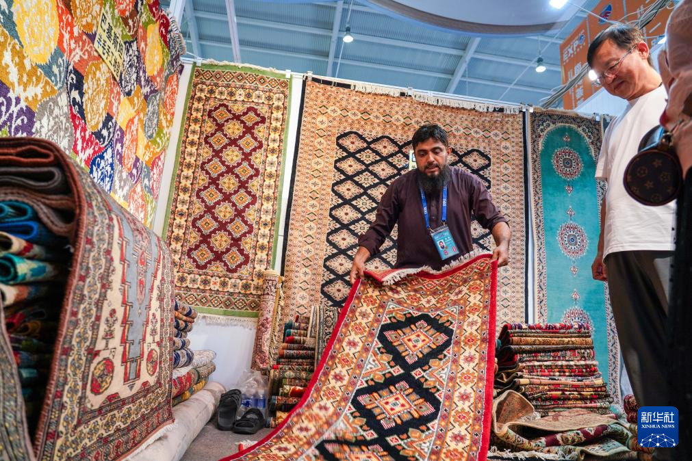 7月26日,在第八届南博会南亚馆巴基斯坦展区,参展商(左)向观众推介地毯。
