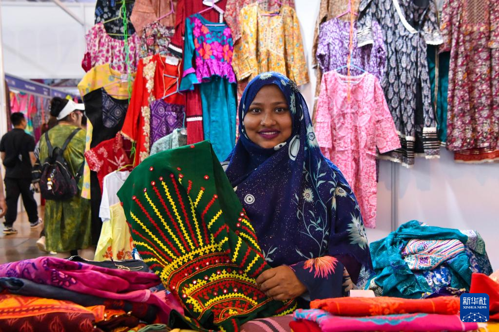 7月26日,孟加拉国参展商展示本国特色服饰。