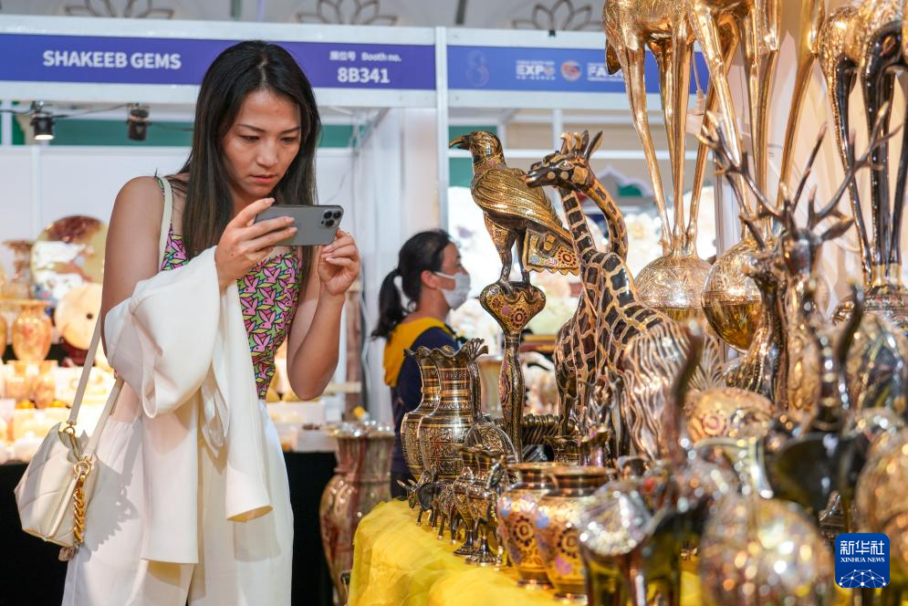 7月26日,在第八届南博会南亚馆,参观者在巴基斯坦展区拍摄特色商品。