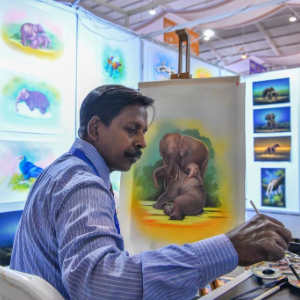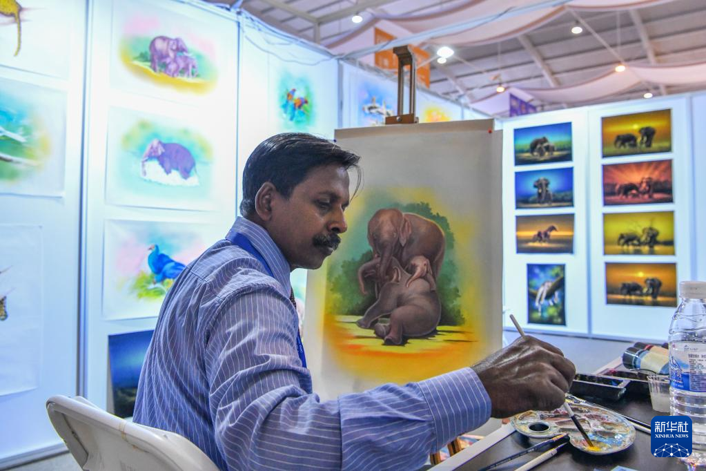 7月26日,斯里兰卡参展商在南亚馆现场作画。