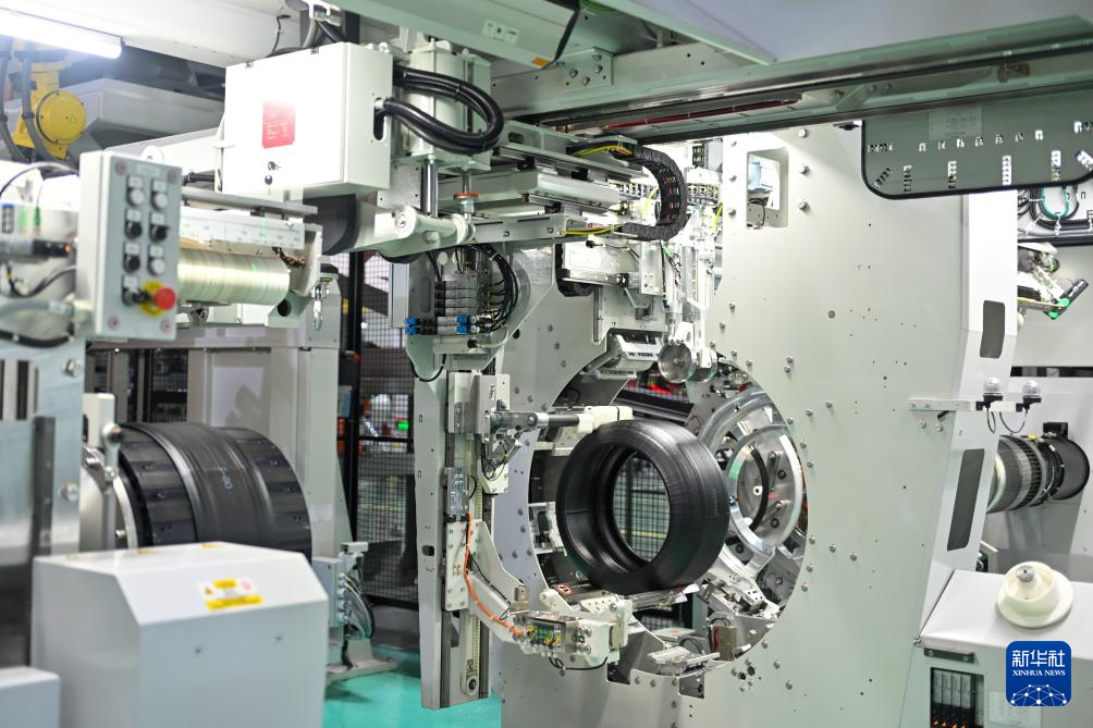 这是7月26日拍摄的杭州中策钱塘实业有限公司轮胎数字工厂车间内的自动化轮胎生产线。