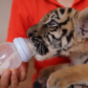 7月25日,在抚州仙盖山野生动物园,饲养员在给东北虎幼崽喂奶。