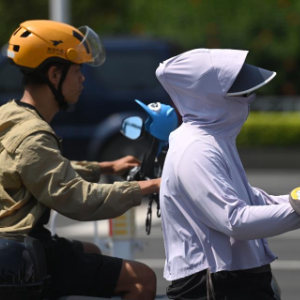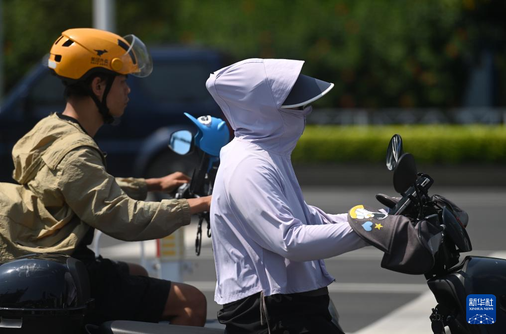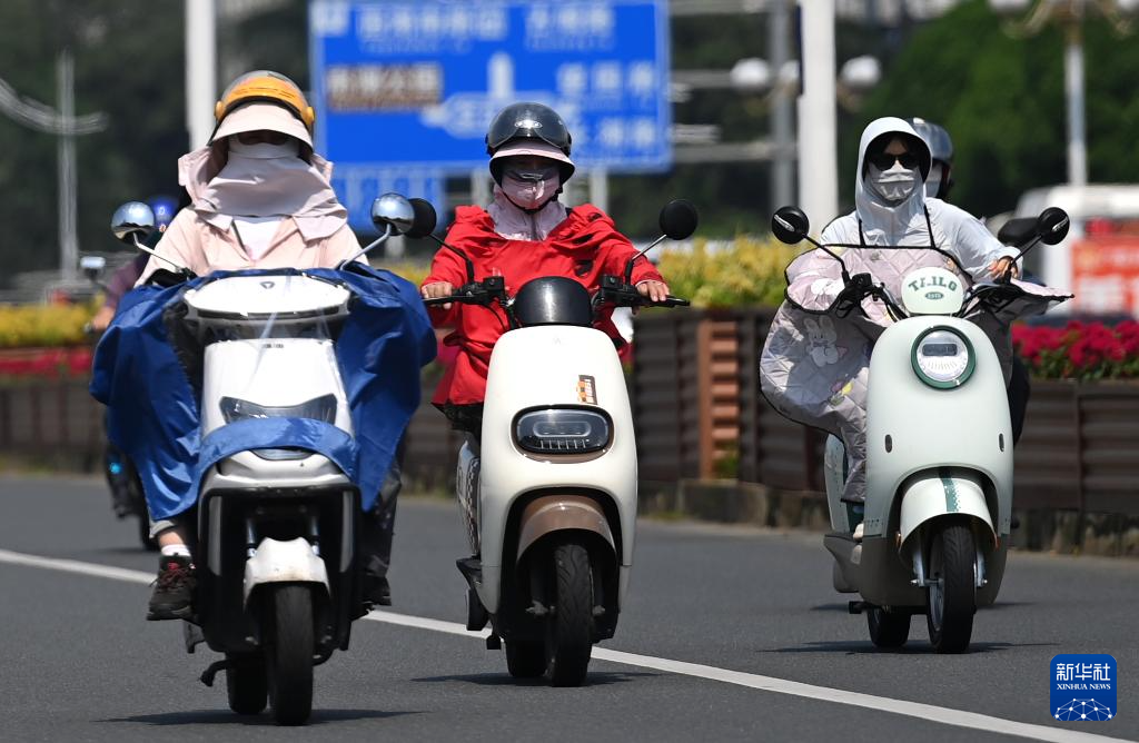 7月26日,人们穿戴防晒装备骑行在广西南宁市街头。