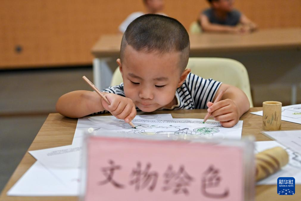 小朋友在太原博物馆体验文物绘色(7月4日摄)。