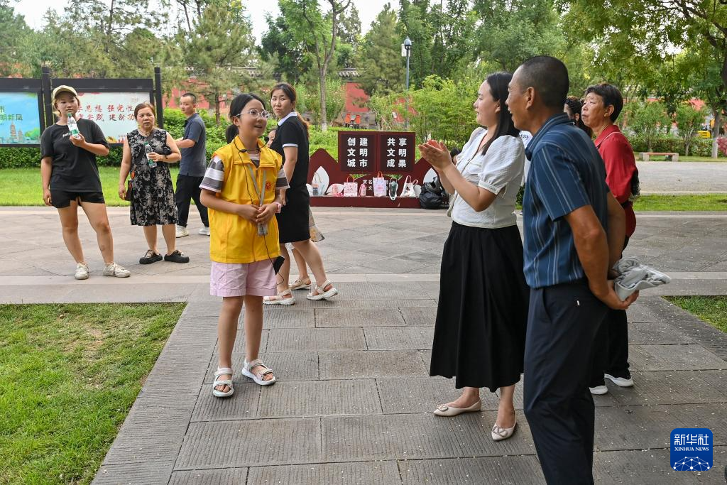 太原市双塔博物馆小讲解员薛梓瑜(前左)为游客讲解(7月25日摄)。