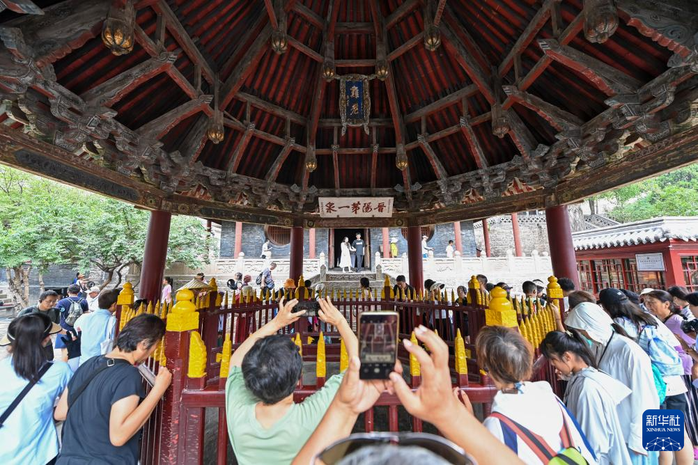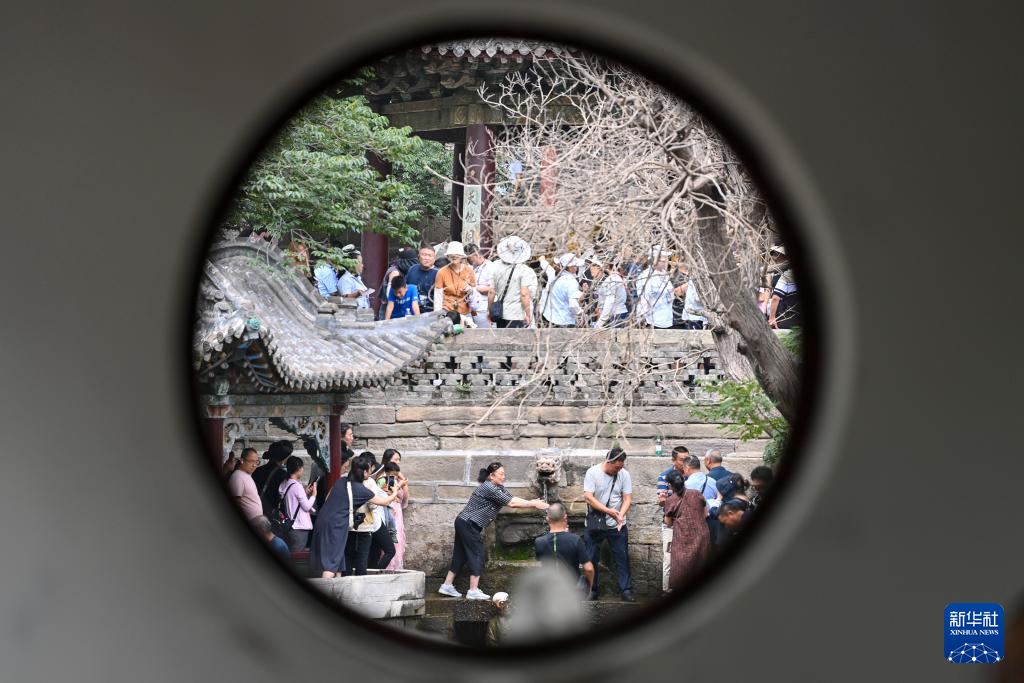 游客在晋祠博物馆的难老泉参观拍照(7月25日摄)。