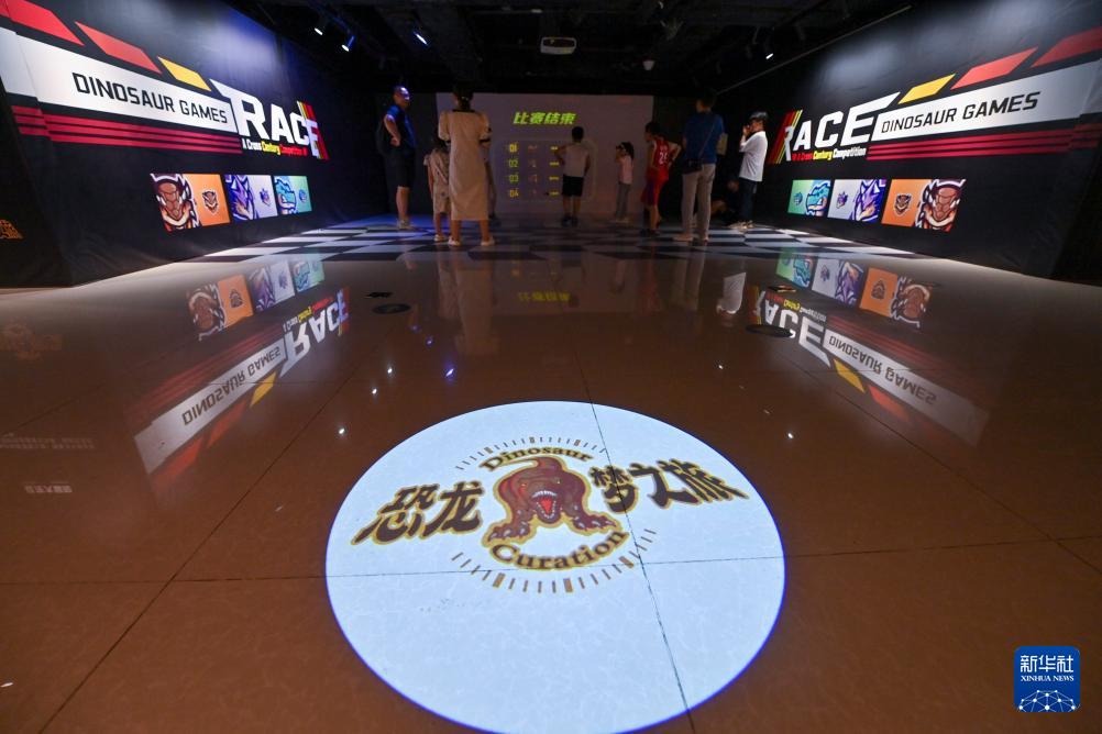 游客在山西自然博物馆体验“恐龙梦之旅”互动游戏(7月24日摄)。