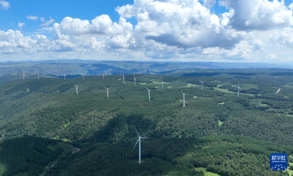 7月25日拍摄的河北省围场满族蒙古族自治县御道口镇附近的风电场景色(无人机照片)。