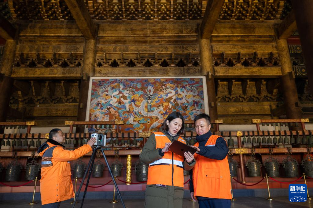 北京市测绘设计研究院团队在太庙进行测绘(2023年2月19日摄)。数字测绘技术为人们认识和保护北京中轴线带来新的可能。2020年9月开始,北京市测绘设计研究院的技术团队,开展了北京中轴线遗产点实地测绘。他们搭建的“实景三维中轴线”,将一条数字孪生版的北京中轴线呈现在世人面前。 数字测绘技术从文物保护、环境整治、文物腾退等方面为北京中轴线申遗提供了高精度、三维立体的空间数据底板。未来,北京市测绘设计研究院团队将持续利用科技手段,助力文化遗产保护。
