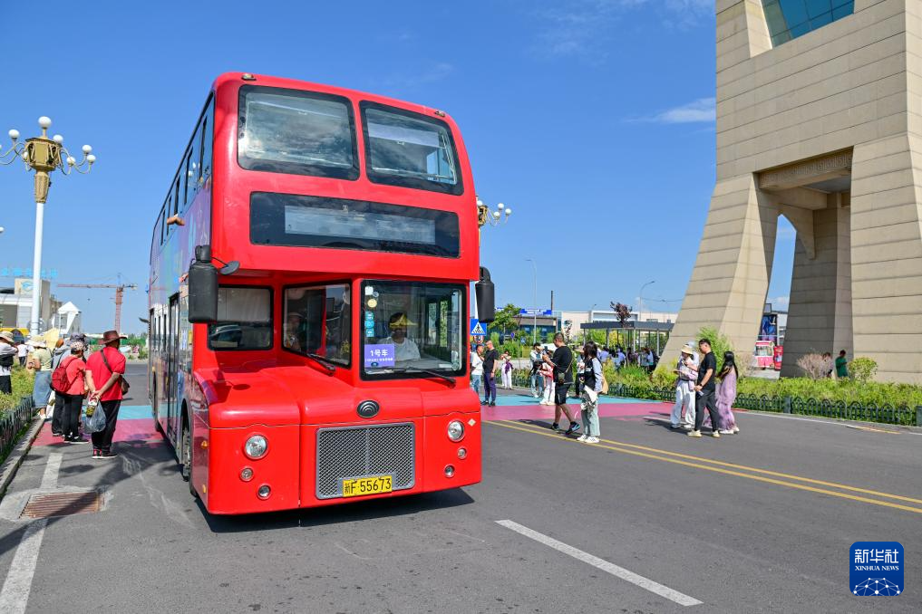 在中哈霍尔果斯国际边境合作中心,旅游巴士进入中方一侧(7月26日摄)。