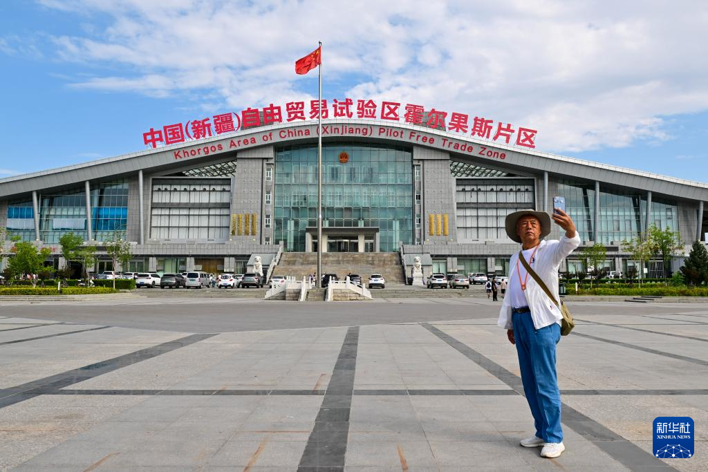 游客在中哈霍尔果斯国际边境合作中心联检大楼门前拍照留念(7月26日摄)。