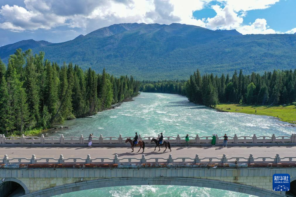 在新疆阿勒泰地区喀纳斯景区,喀纳斯边境派出所民警在骑马巡逻后返回马场(7月22日摄,无人机照片)。