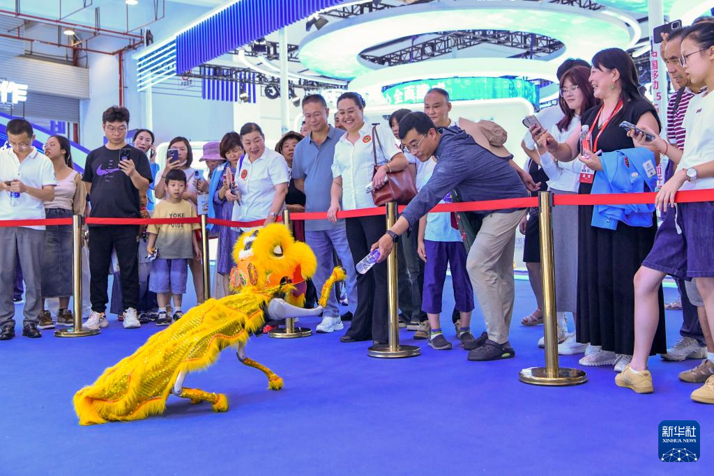7月25日,观众在南博会展馆内和“舞狮机器狗”互动。