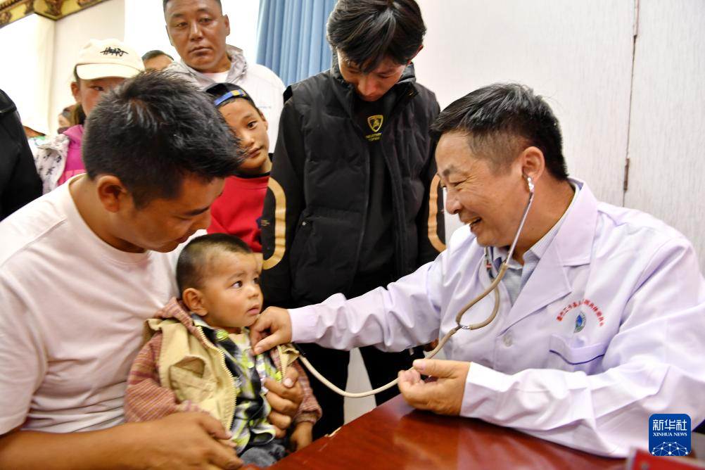 7月23日,南京医科大学附属儿童医院心脏中心主任莫绪明(右)在墨竹工卡县为儿童仔细体检并检查。