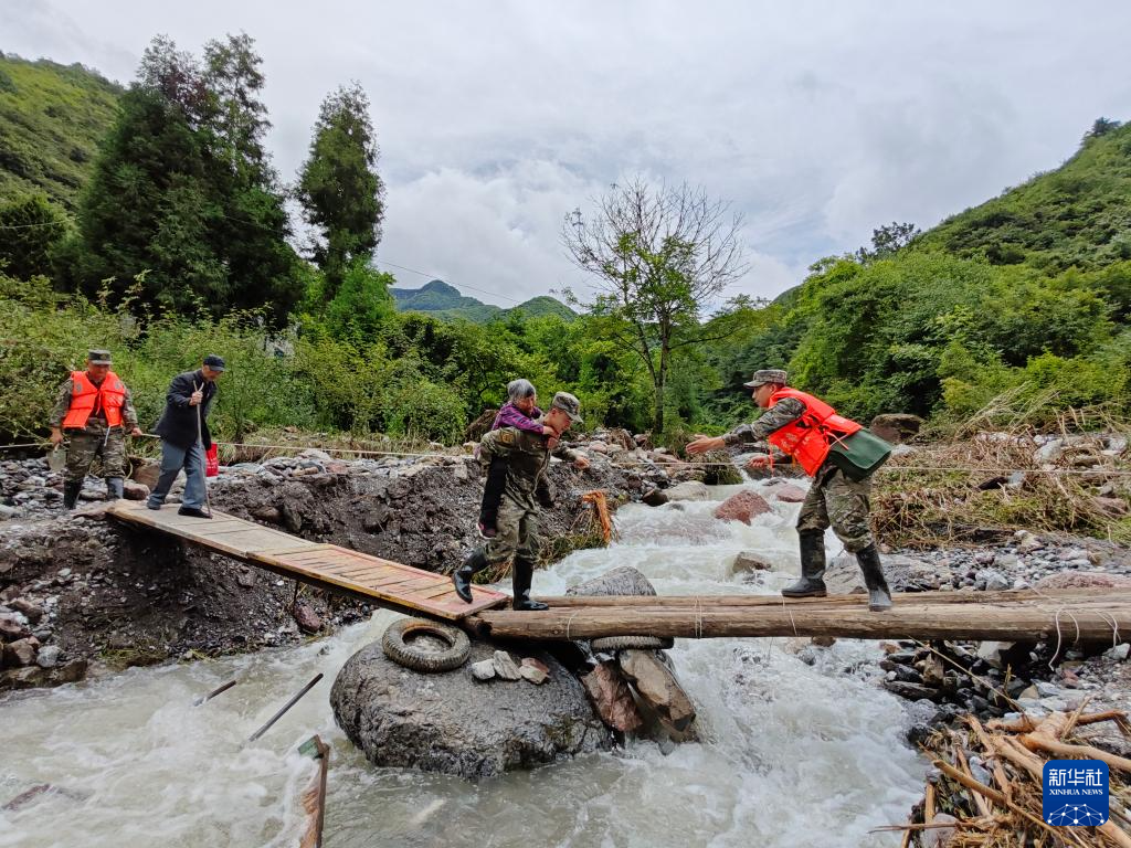 7月21日,在四川省雅安市汉源县马烈乡新华村,武警四川总队雅安支队官兵搭建简易桥梁转移群众。