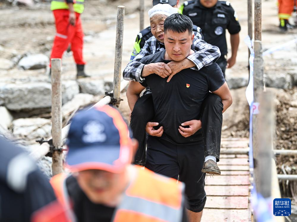 7月21日,在四川省雅安市汉源县马烈乡新华村,救援人员在转移受灾群众。