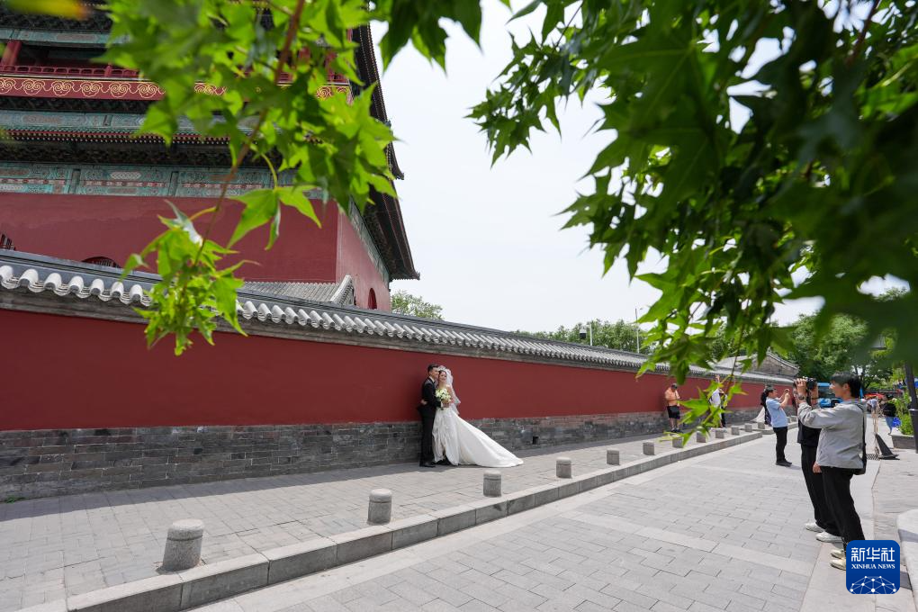 一对新人在鼓楼外拍摄婚纱照(6月2日摄)。