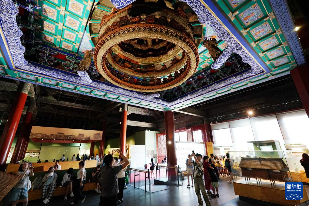 人们在鼓楼内观看鼓楼和钟楼模型(7月16日摄)。