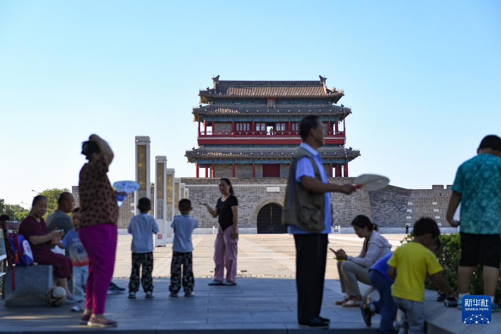 在北京永定门公园,游客在参观游览(7月18日摄)。