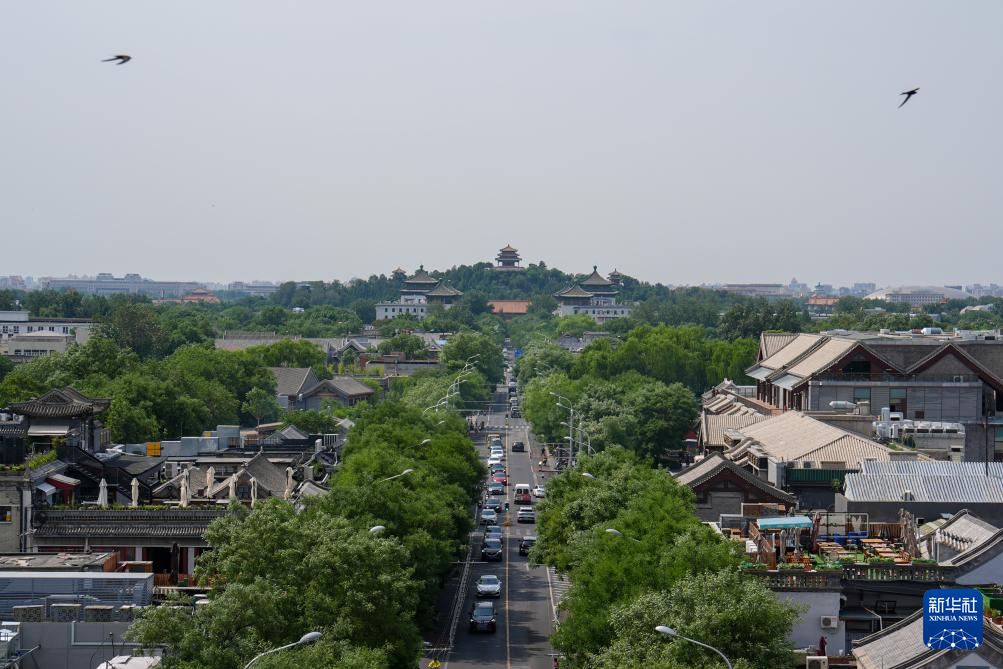 在鼓楼上拍摄的北京中轴线风光,远处是景山公园万春亭(6月2日摄)。