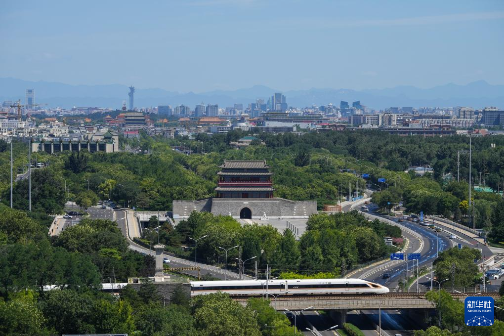 一列复兴号高铁列车驶过北京永定门城楼前(7月18日摄)。
