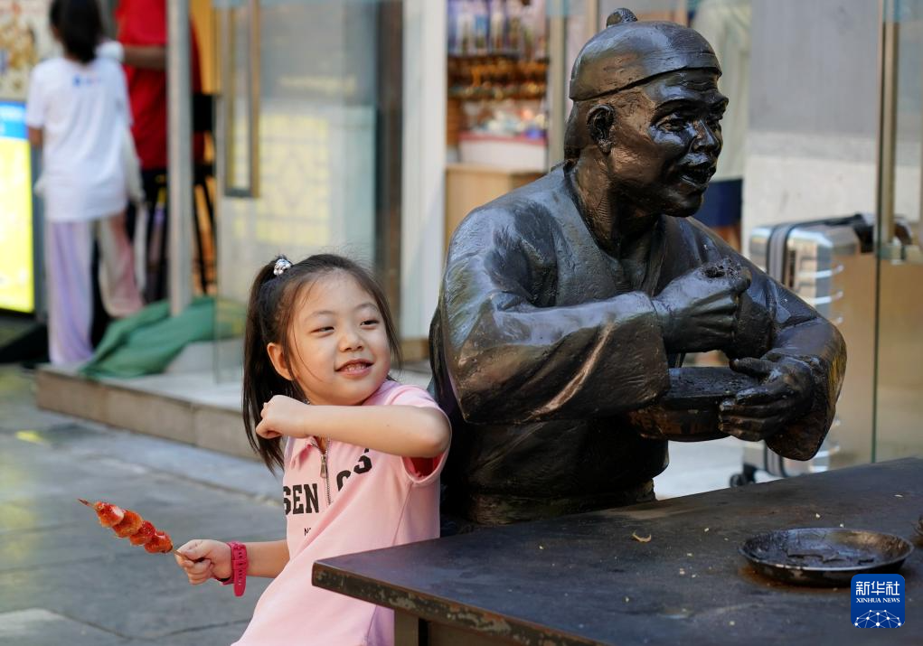 一名小朋友在北京前门大街游玩(7月17日摄)。