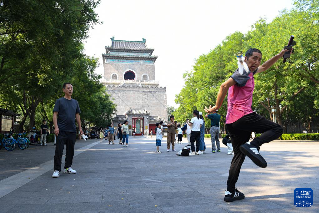 市民在北京钟鼓楼文化广场踢毽子(7月3日摄)。