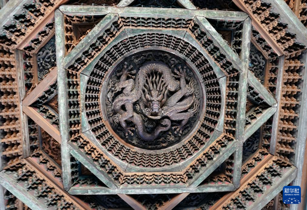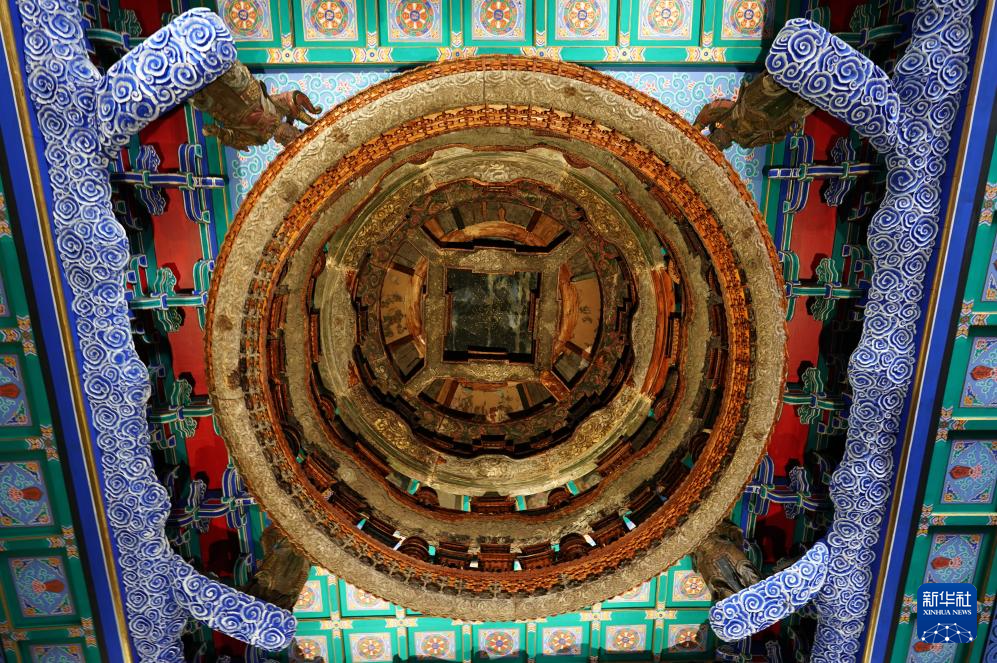 这是7月17日在先农坛拜殿内拍摄的北京隆福寺毗卢殿明间藻井。