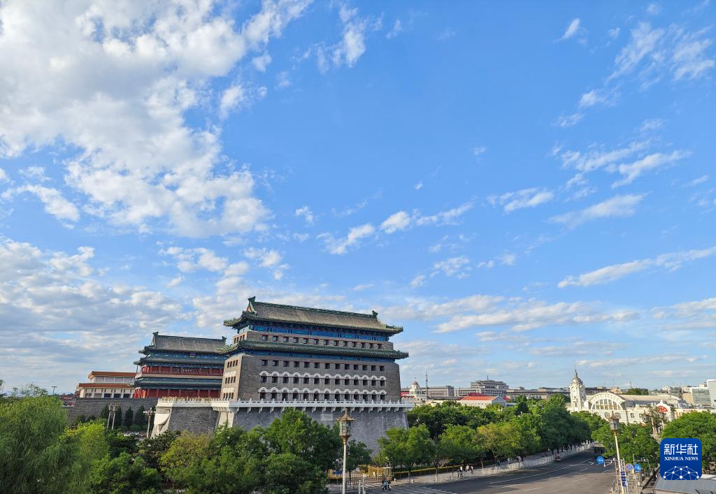蓝天白云下的毛主席纪念堂、正阳门城楼、正阳门箭楼(左至右,5月31日摄)。
