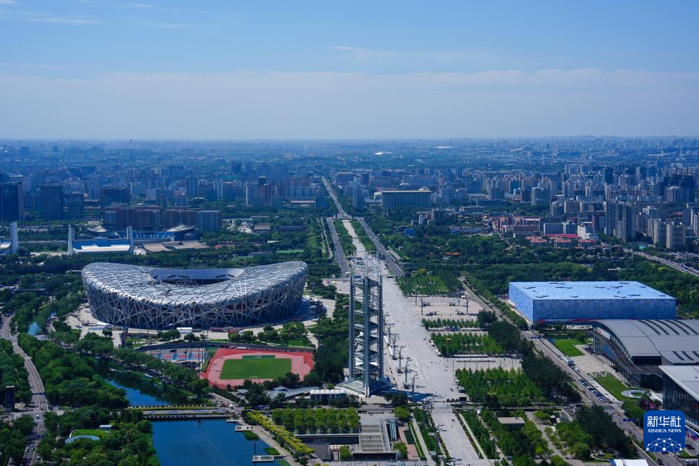 从奥林匹克塔拍摄的北京中轴线上的部分建筑群和中轴线延伸线上的“鸟巢”“水立方”等(7月17日摄)。