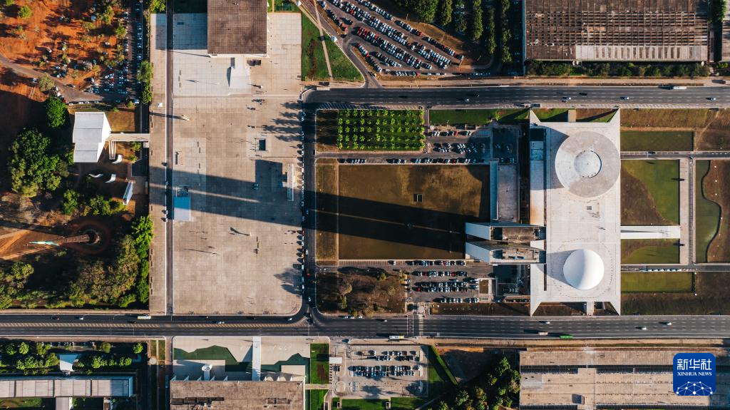 这是2024年7月16日在巴西首都巴西利亚拍摄的国会大厦以及三权广场(无人机照片)。