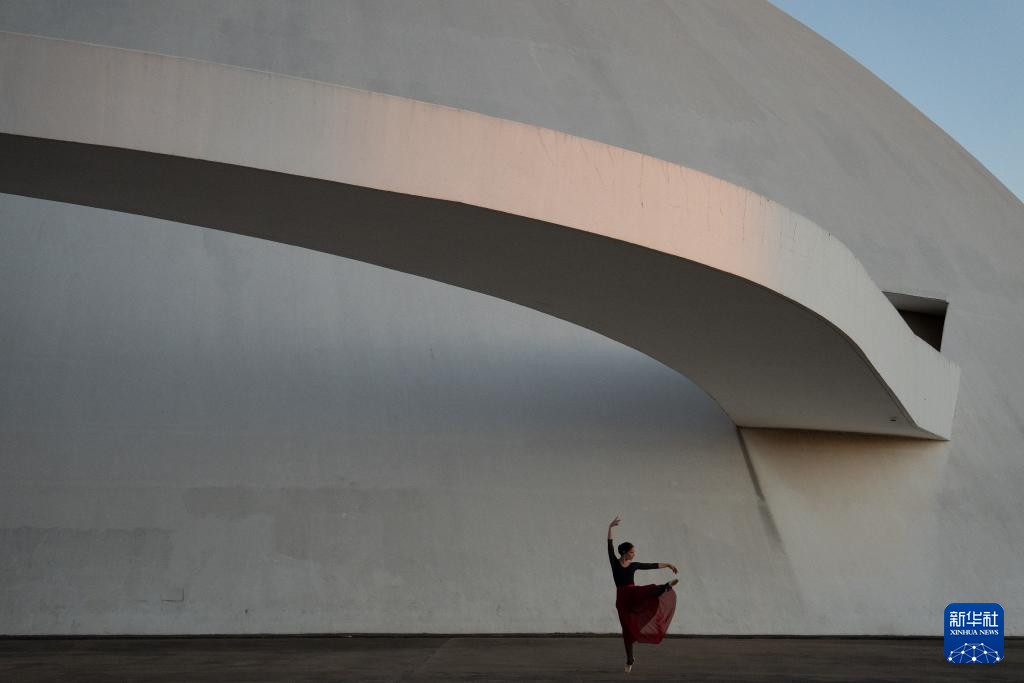 2024年7月14日,一名芭蕾舞演员在巴西首都巴西利亚国家博物馆前练习。