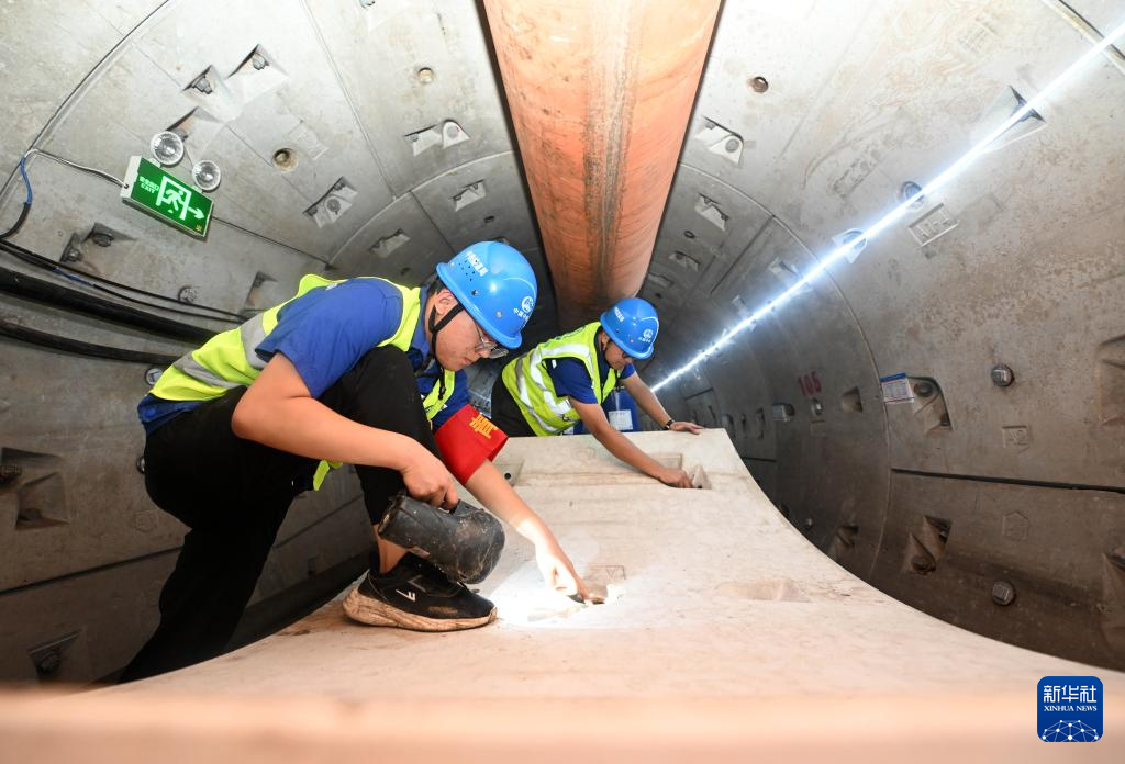 7月30日,工作人员在雨水主管隧道内检查盾构管片拼接情况。