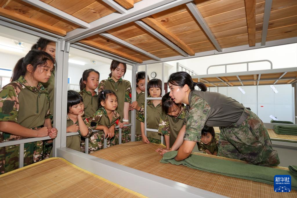 陆军第72集团军某旅组织“奋斗强军·少年行”主题夏令营活动,女兵班长教军娃们整理内务(7月30日摄)。