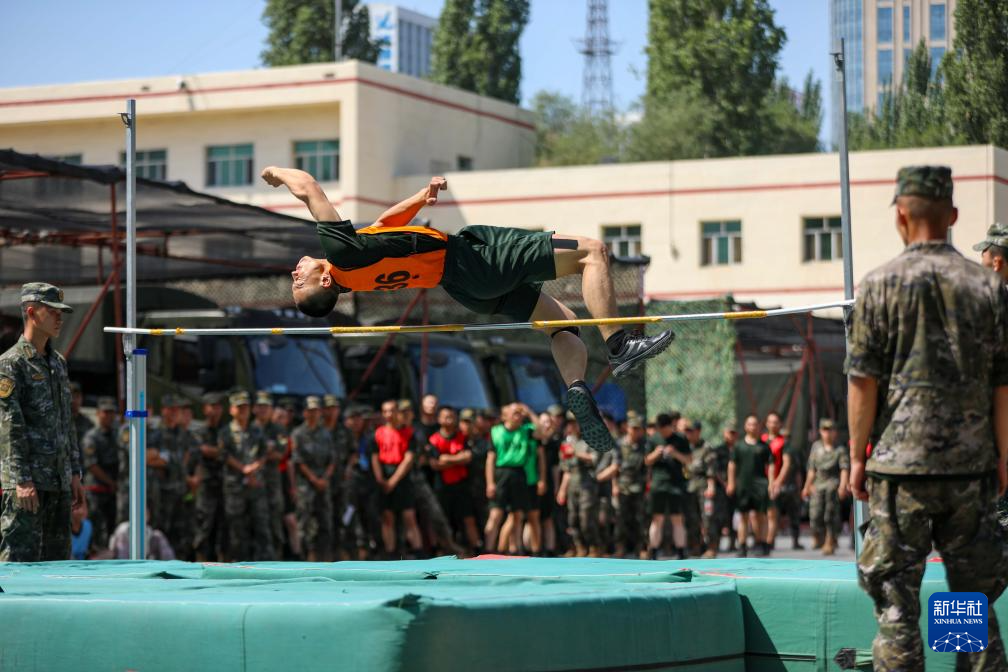 武警新疆总队某支队开展军体运动会暨“八一枪王”挑战赛,官兵们观看跳高比赛(7月30日摄)。