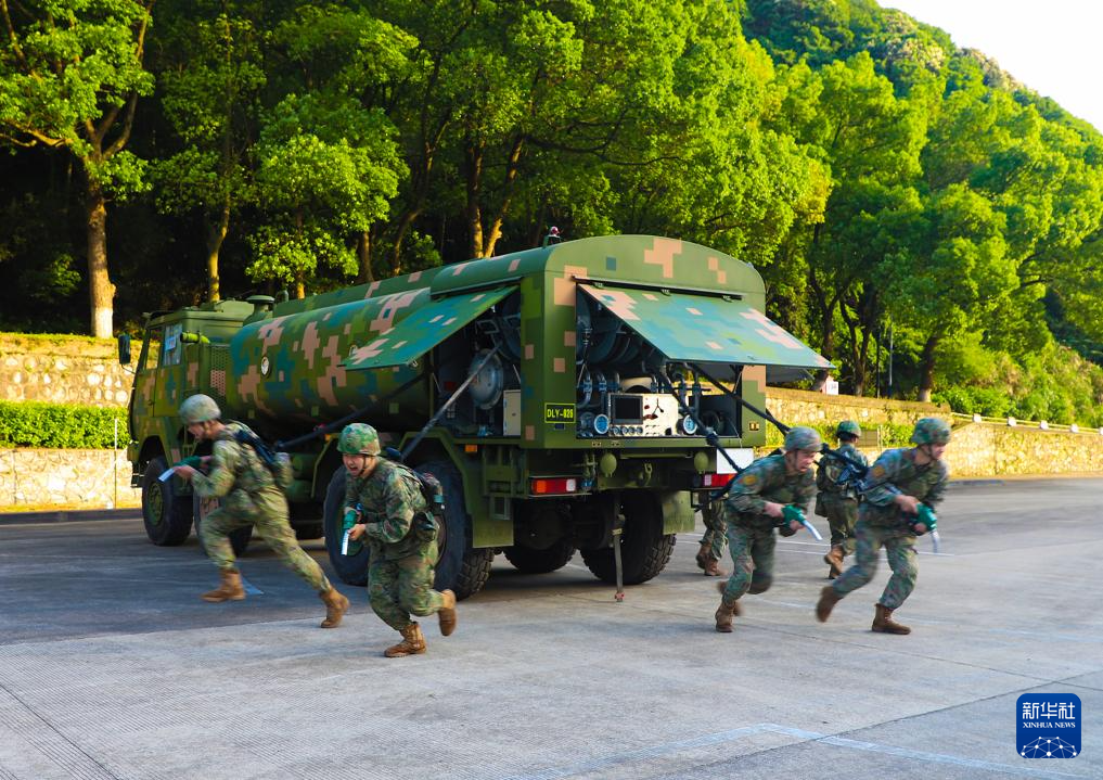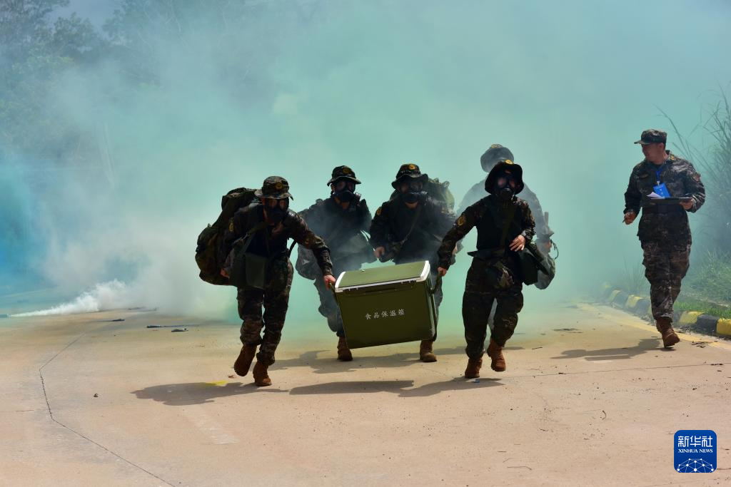 武警广东总队组织野战炊事综合能力考核,炊事员穿越“毒区”转运物资(7月30日摄)。