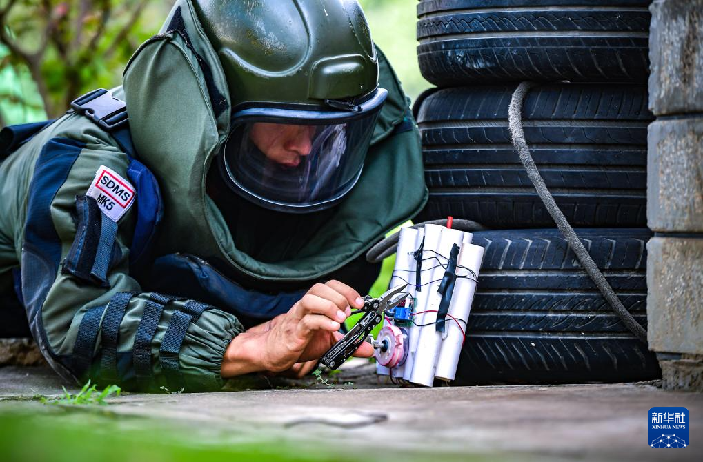 武警湖北总队机动支队某部官兵身着排爆服进行拆弹训练(7月31日摄)。