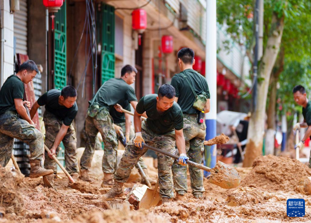8月1日,武警湖南总队郴州支队官兵对湖南资兴市八面山瑶族乡018县道进行清淤任务,帮助当地群众恢复道路交通。