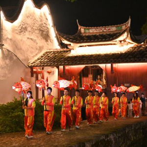 浦源村鲤鱼溪景区内进行的鲤鱼灯习俗表演(7月29日摄)。
