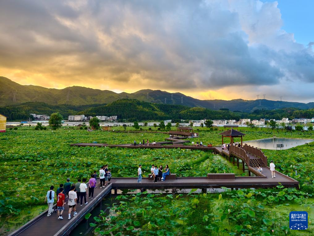 7月29日,游客在浦源村鲤鱼溪景区游览百亩荷塘。