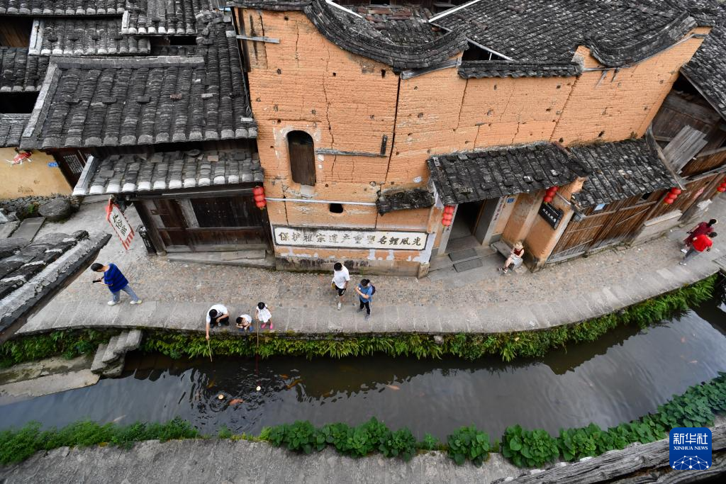 7月14日,浦源村鲤鱼溪内的鲤鱼与古民居倒影相映成趣。