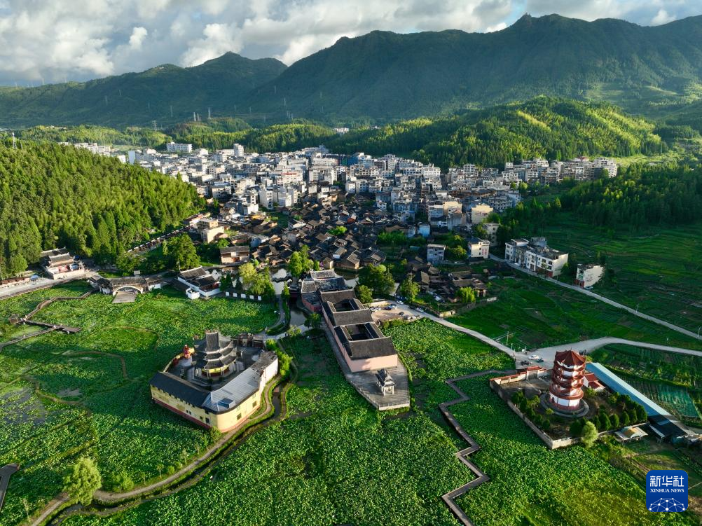 这是7月12日拍摄的浦源村百亩荷花塘及村内古建筑群(无人机照片)。