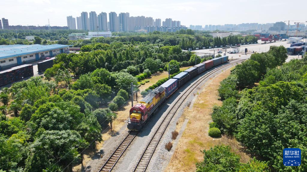8月1日,一列中欧班列驶出合肥北站物流基地(无人机照片)。