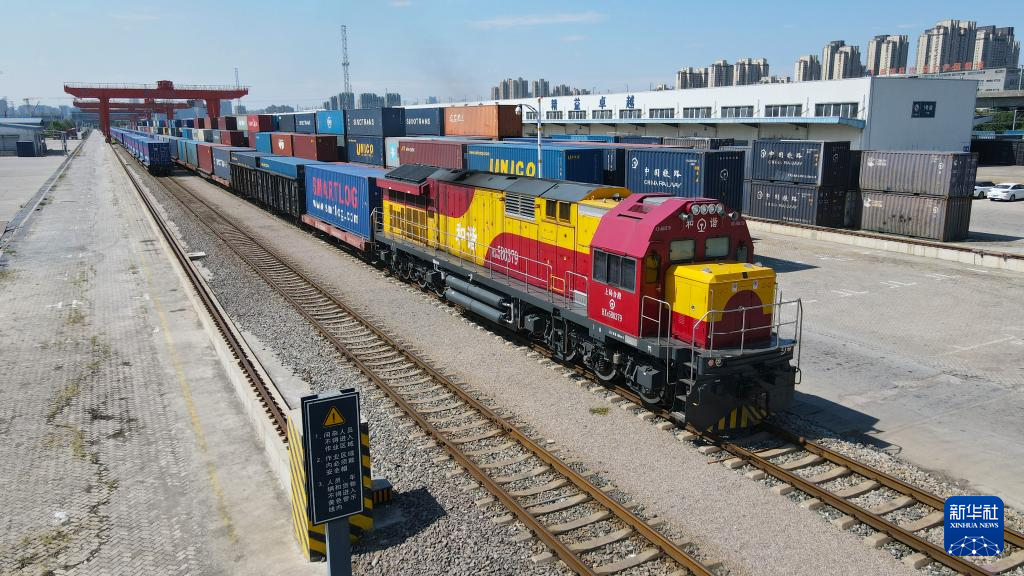 8月1日,一列中欧班列在合肥北站物流基地等待发车(无人机照片)。