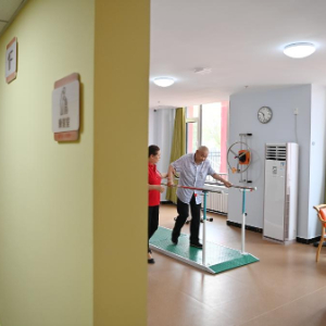 8月1日,在西青区第一养老院,老人在康复室内锻炼。