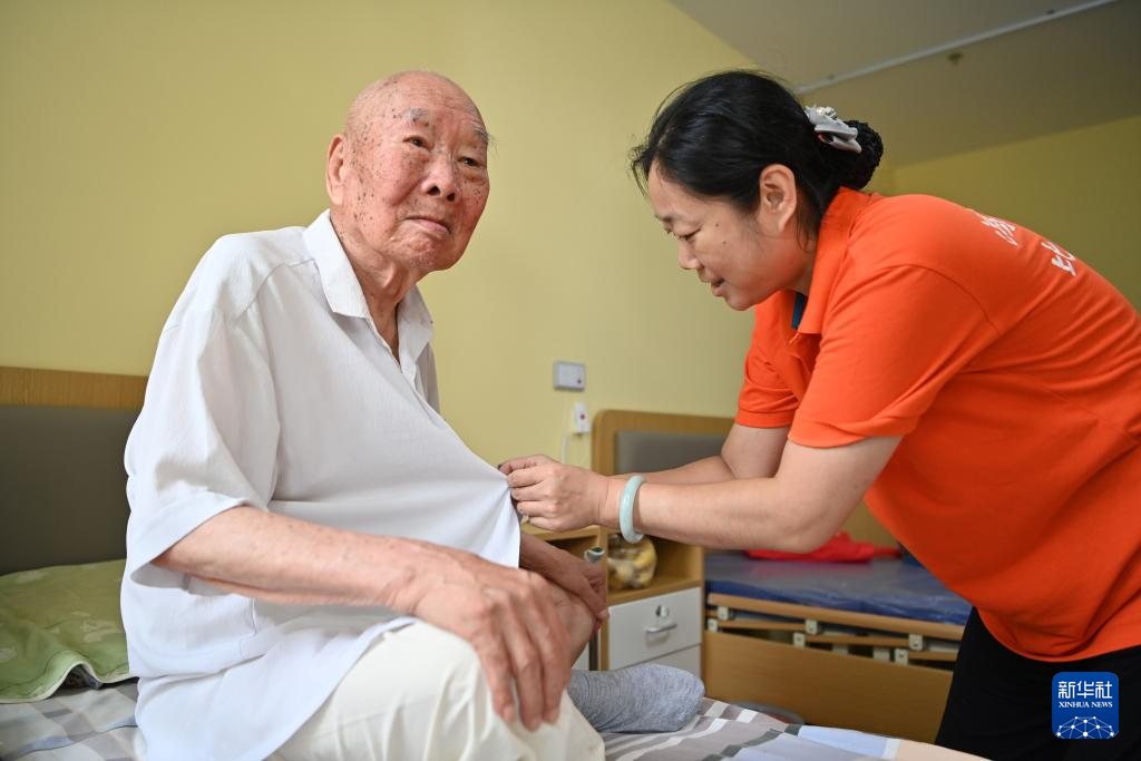 8月1日,在西青区第一养老院,护理人员帮助老人系扣子。