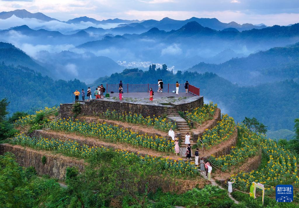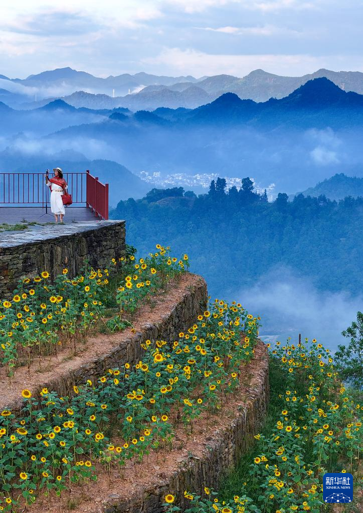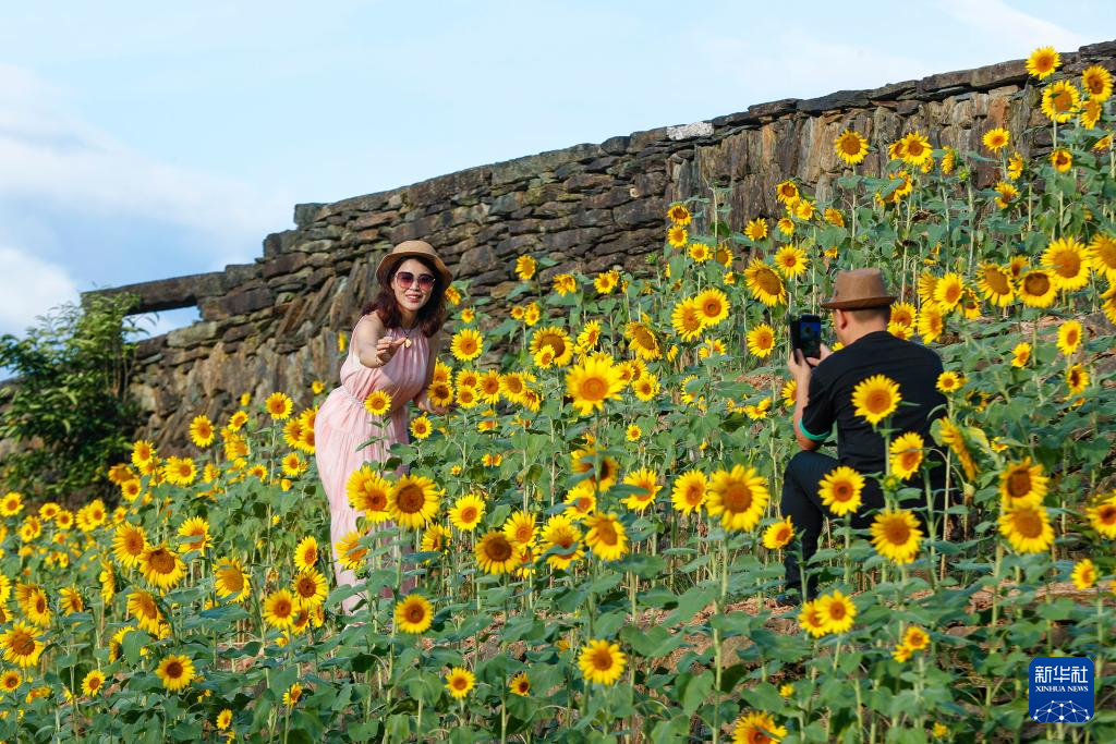 8月1日,游客在安徽省黄山市歙县石潭古村向日葵花田中游玩赏景。
