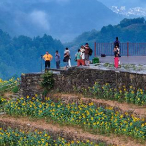 8月1日,游客在安徽省黄山市歙县石潭古村花田中游玩赏景。