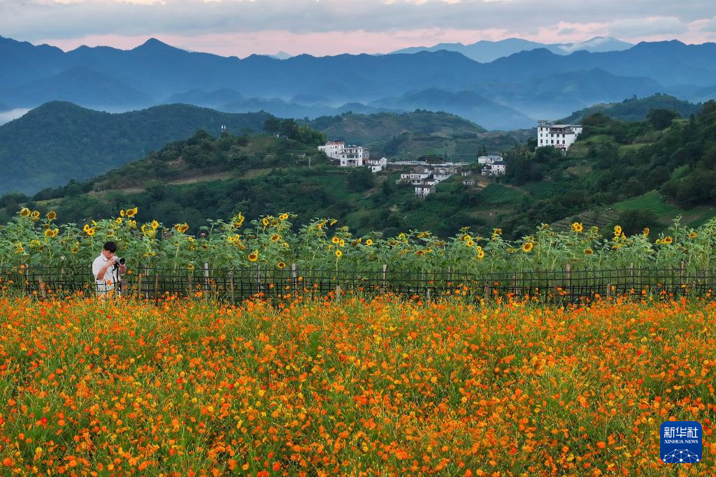 夏日里,安徽省黄山市歙县石潭古村盛开的各种花儿与徽派民居相互映衬,游客徜徉花海间,感受诗意乡村。